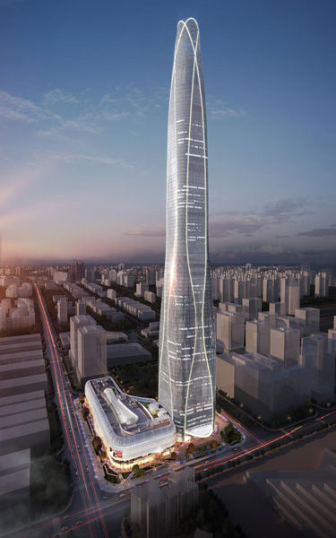 “天津周大福中心”位于第一大街与新城西路交汇处,地处滨海新区现代服务产业区MSD规划范围内,为中建八局在建工程的第一高。其建筑高度为530米,建筑楼层101层,地上塔楼高97层,地下4层,还有5层连接塔楼的裙房。