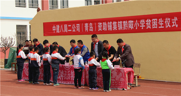 4月8日上午,在了解到胶州铺集镇黔陬小学家庭贫困学生较多需要资助的情况后,中建八局二公司青岛分公司十典九章志愿者爱心团队迅速组织,将员工们自愿捐助的助学金和文体用品带到了学校。同时到来的还有胶州云溪办事处领导、铺集镇教育办公室领导及部分参与捐助的分公司领导和员工。