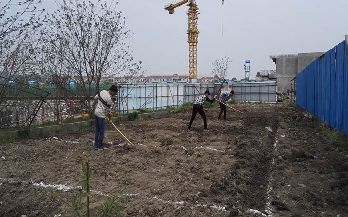 4月9日,中建八局上海深坑酒店项目利用周末空闲时间,发动项目管理人员开荒种地。